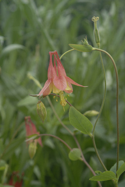 Features:  Illinois' only native Columbine, with its unique  red and yellow drooping flowers, is more colorful and desired by pollinators than non-native garden varieties. Works well in a woodland garden but will also grow in sunnier sites. It is an early bloomer and may self-seed and move around each year but does not take over or spread too much.